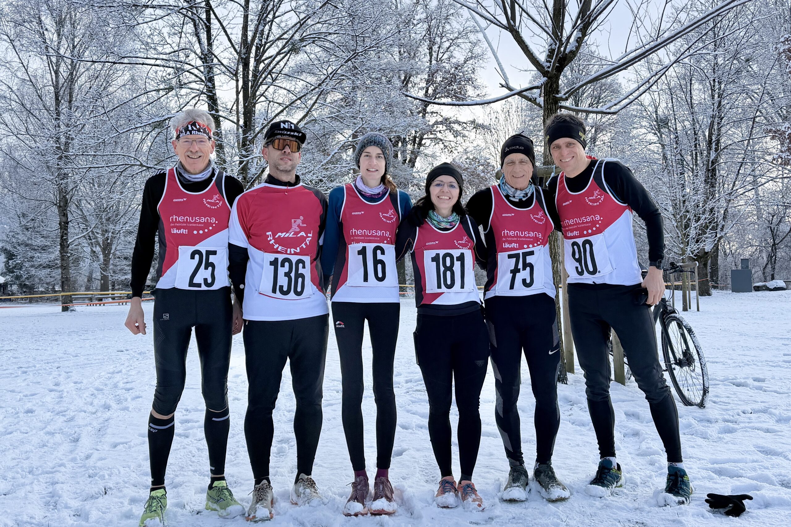 Nun denn, vom Start weg und in jeder Runde ist der erste km auf Asphalt, wo diese Wahl schon mal gut war. Aber die anderen 2/3 der Runde waren schneebedeckte Schotterpiste. Warum erwähne ich dies so explizit, na ja, weil wir solche Bedingungen schon lange nicht mehr hatten und weil es bei diesen Bedingungen auch deutlich anstrengender ist. Es ging auch das Gerücht umher, dass dies auch der Grund war, weshalb heute nur so wenige Teilnehmer am Start waren. Immerhin, die 7 von MILA Rheintal haben den Bedingungen getrotzt und konnten durchwegs gute Leistungen zeigen.