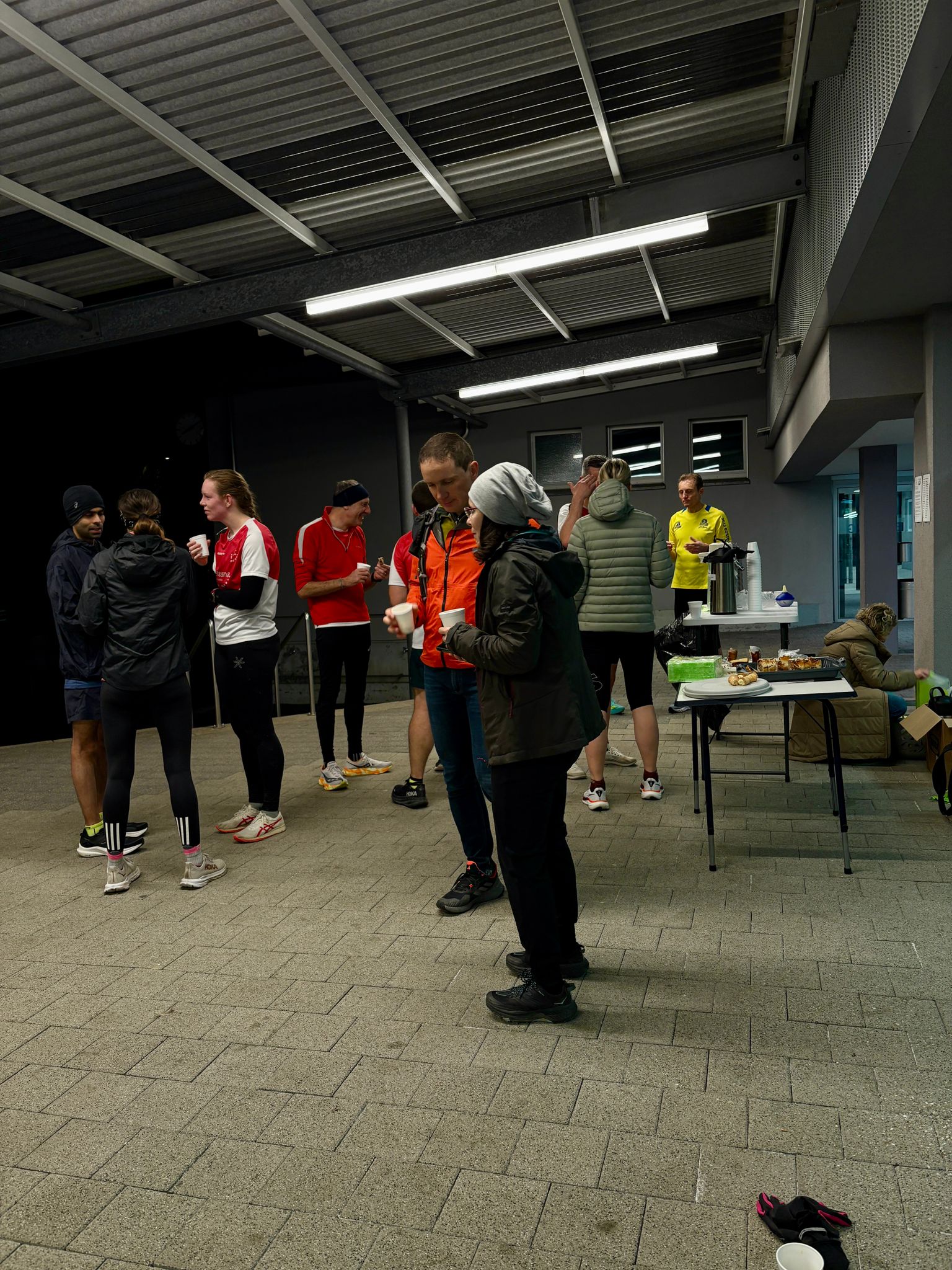 Nach dem Neuschnee in der vergangenen Nacht (ca. 5..10cm) gab es bei den Meisten eine gewisse Unsicherheit bzgl. der Wahl der Lauf-Schuhe. Ich habe manche mit Trailschuh gesehen und muss zugeben, ich hatte sie auch eingepackt. Aber nach der Streckenbesichtigung entschied ich für den leichteren Mizuno mit dem kleineren aber harten Profil das auf Eis- und nicht allzu rauem Untergrund recht guten Grip hat.