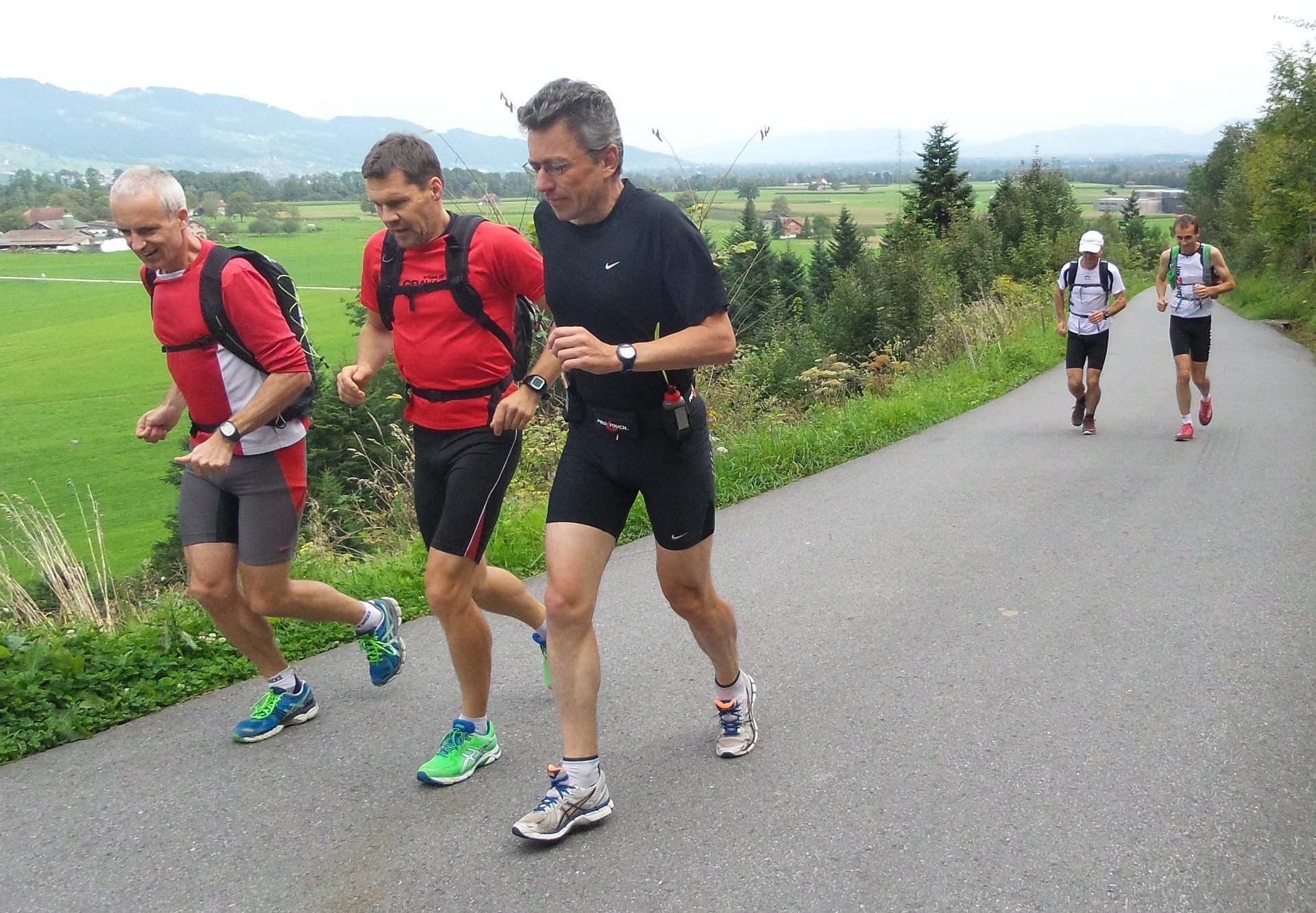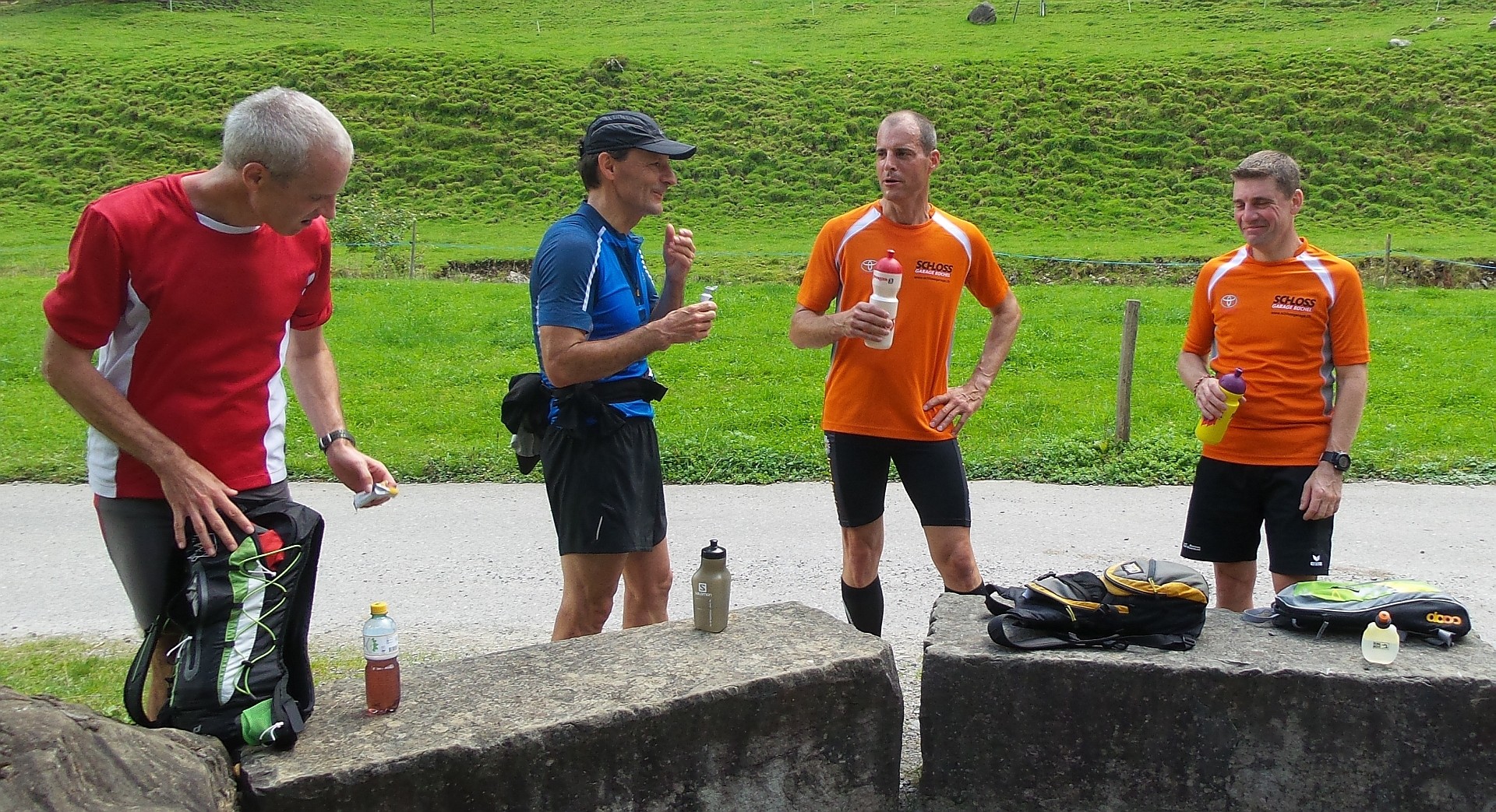 Der grössere Teil der Gruppe, darunter sieben Milas (Roland Segmüller, Berni Litscher, Guido Bischofberger, Andreas Weiler, Markus Halter, Fredy Schmid und Felix Benz), starteten am Samstag, 6. September um 12.00 Uhr beim Schwammlauf-Start in Kobelwies zum schon traditionellen Säntislauf. Bei der Kirche Eggerstanden stiessen noch weitere «Säntisläufer» zur Gruppe, sodass sich total 15 Läufer im schnellen Laufschrift in Richtung Säntisgipfel bewegten. Zwischendurch wurden an verschiedenen Brunnen die Flüssigkeitreserven aufgefüllt. Bis Wasserauen gings ca. 18 km lang relativ flach und schnell vorwärts, nach zwei Stunden war die Endstation der Appenzellerbahn bzw. die Talstation der Luftseilbahn hinauf zur Ebenalp erreicht. Nach Wasserauen erhöhten sich die Steigungsprozente wesentlich. Auf Höhe Seealpsee war der Säntisgipfel für kurz einmal ersichtlich. Doch je höher bzw. je näher die Läufer diesem Ziel kamen, umso dichter wurde der Nebel. Nach einem Halt beim Gasthaus Mesmer respektive nach der Passage der Wagenlücke begann es leicht zu regnen. Doch die Gruppe liess sich wegen dieser Feuchtigkeit von oben und dem fehlenden Weitblick nicht die gute Laune verderben und die schnellsten erreichten mit einer Laufzeit (die versch. Pausen von ca. 45-60 Minuten nicht eingerechnet) von deutlich unter vier Stunden das Gasthaus Alter Säntis bzw. den Säntisgipfel auf 2’502 Meter über Meer. Die Laufstrecke betrug gemäss GPS-Auswertung 27,6 Km, sie beinhalten 2’290 Meter Steigungen und 265 Meter Gefälle. Nach kurzer Verpflegung beförderte die Säntisbahn die Läufergruppe hinunter nach Schwägalp, von wo es mit Autos wieder zurück in Rheintal ging.