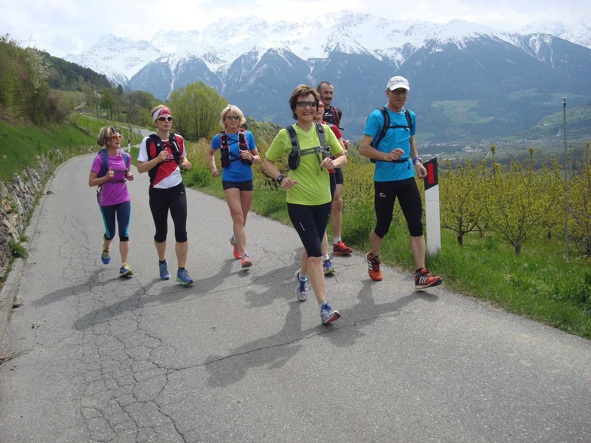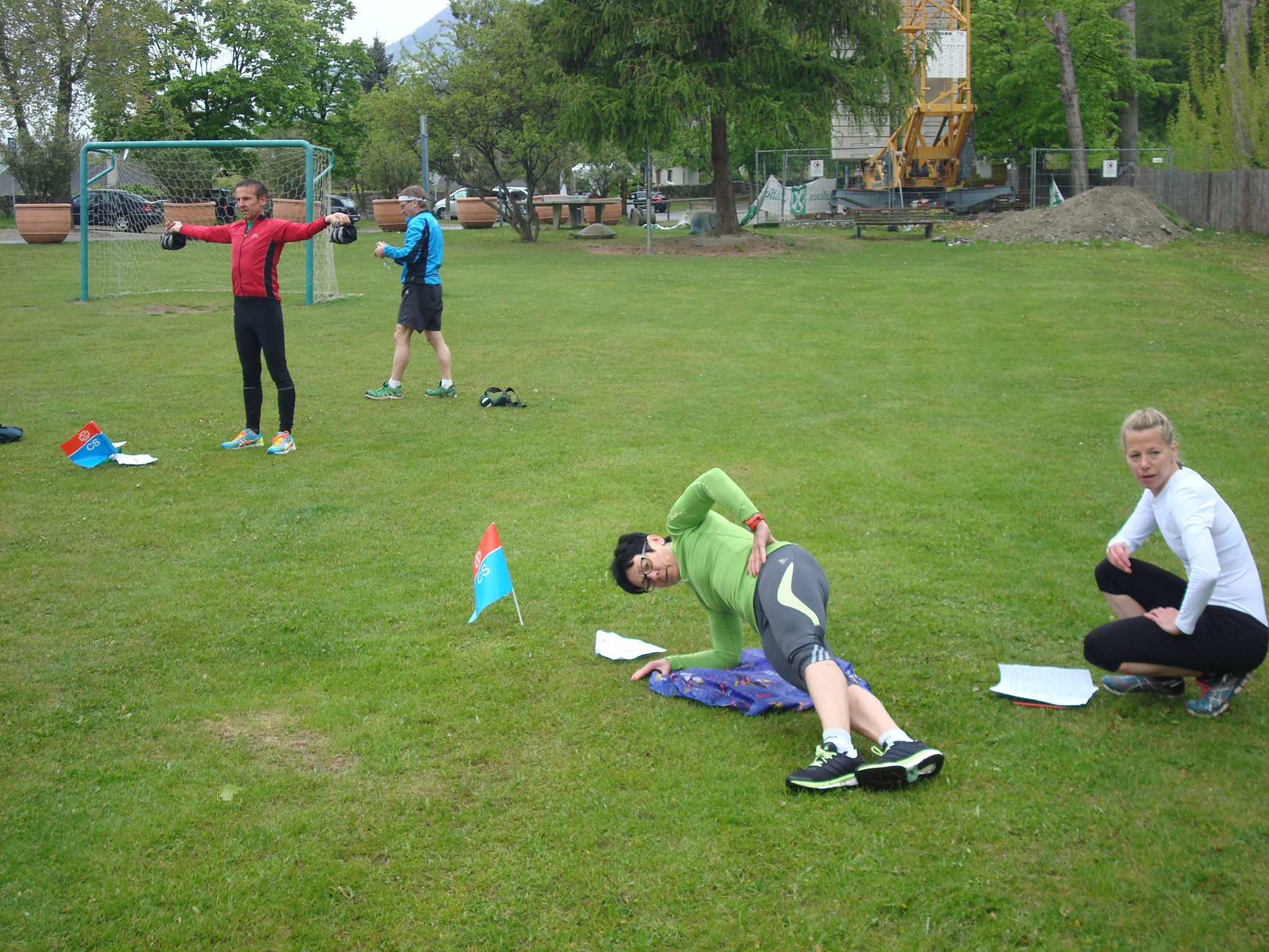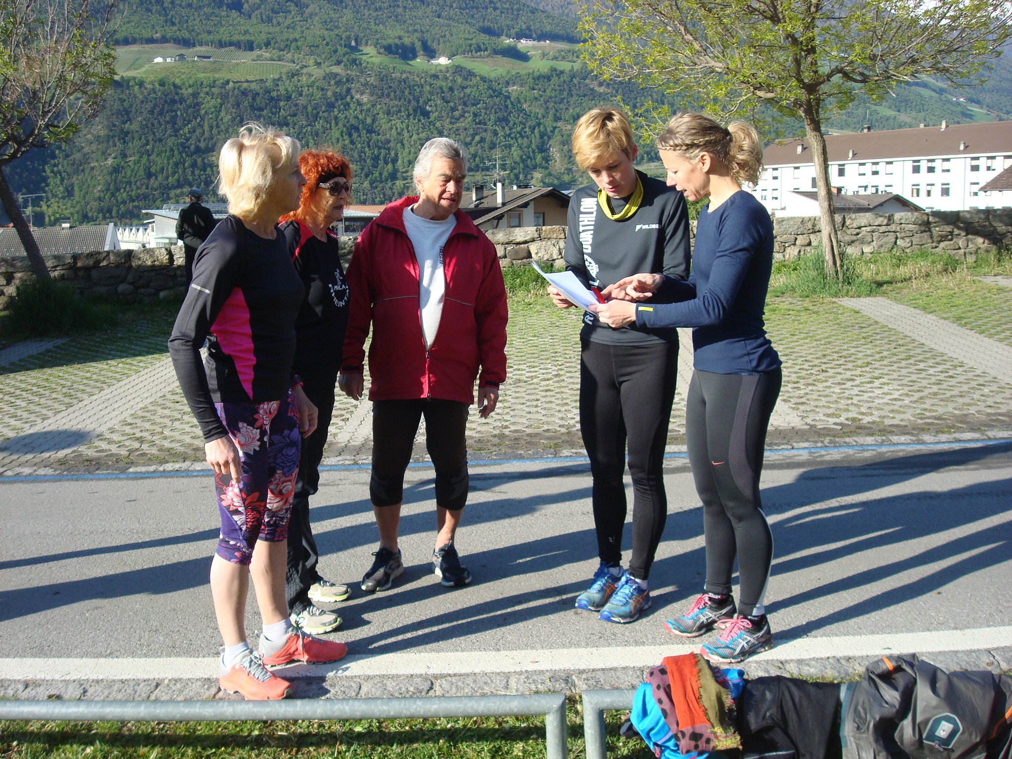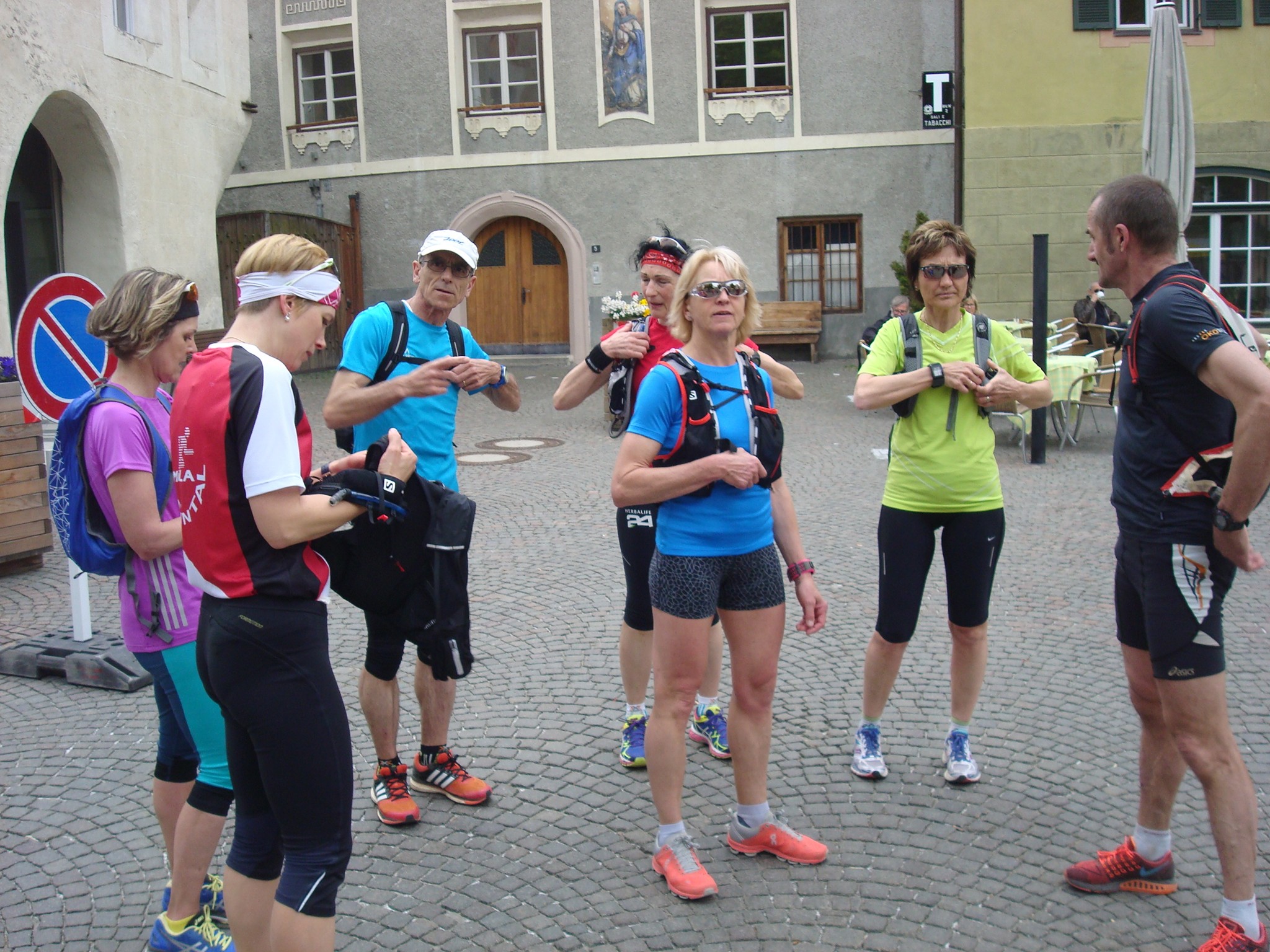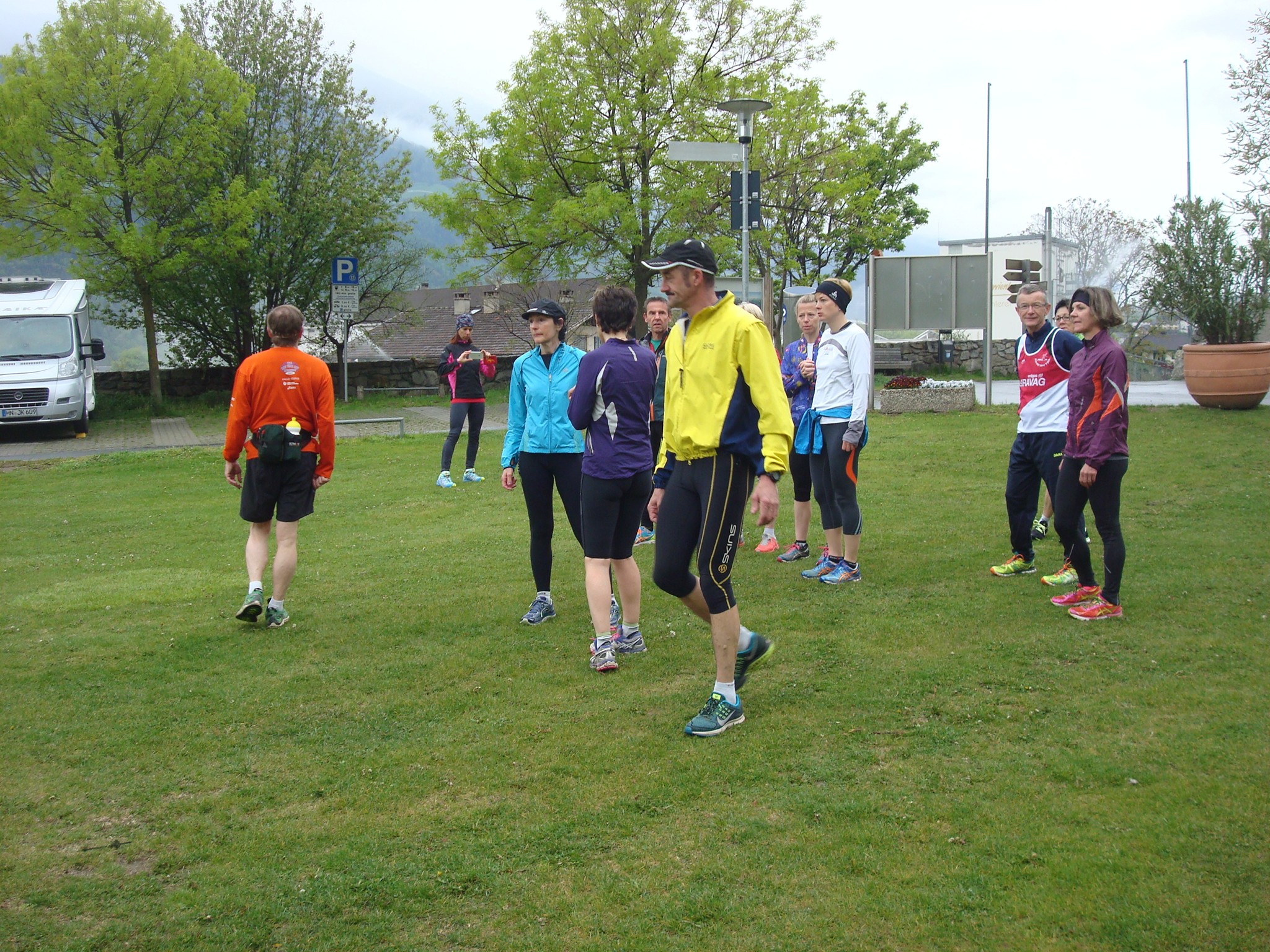 Am Samstag um 07.30h eröffnete Berni das Training auf dem Marktplatz mit einer Denksportaufgabe, was alle Teilnehmer ohne straucheln meisterten. Felix übernahm danach und wir starteten bergwärts. Nach dem Einlaufen und Dehnen forderte ein anspruchsvoller kurzer Rund Trail die MILAS während 15 Minuten. Wir mussten möglichst schnell den Weg über die Steine und Wurzeln finden und den steilen Abstieg über das Geröll als Erholung nutzen. Dieses Training war extrem effizient, zeitsparend und machte viel Spass. Zum Abschluss bewunderten wir den Wasserfall der ganz in der Nähe in die Etsch fliesst.