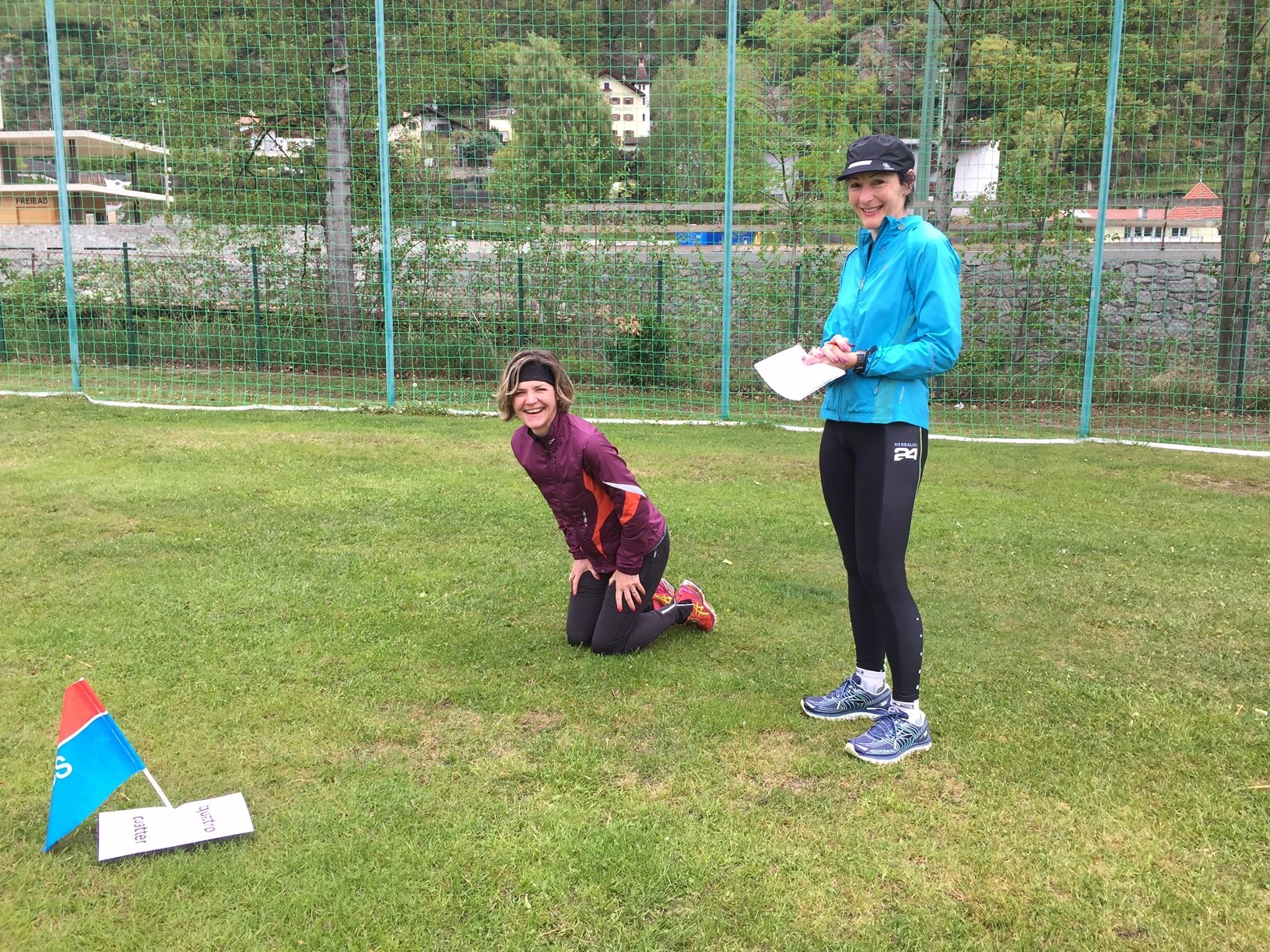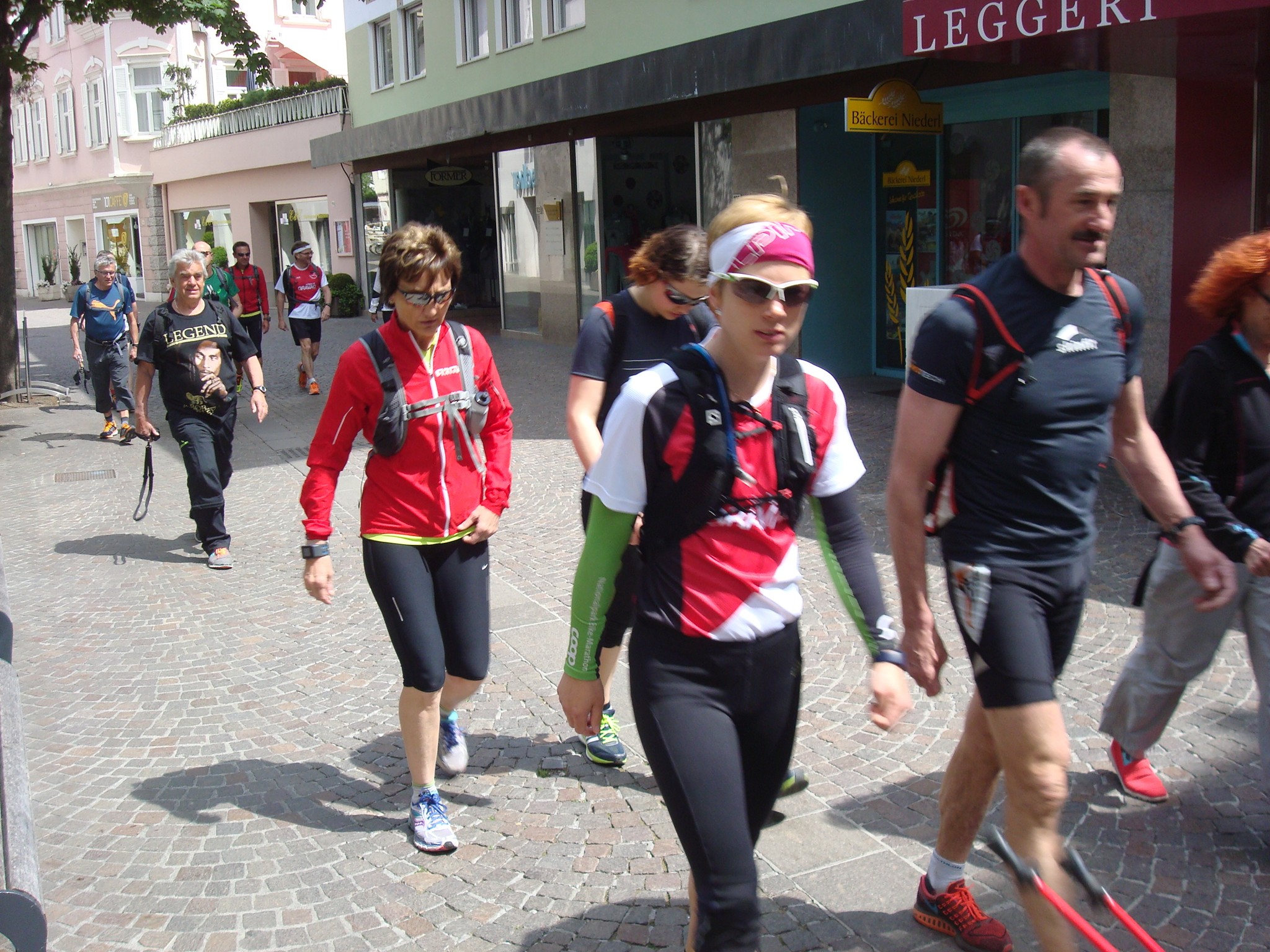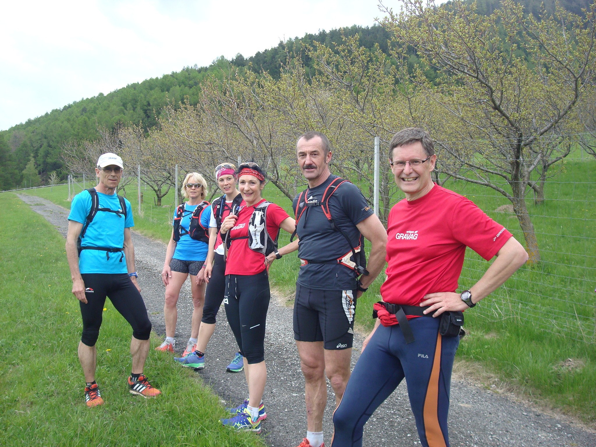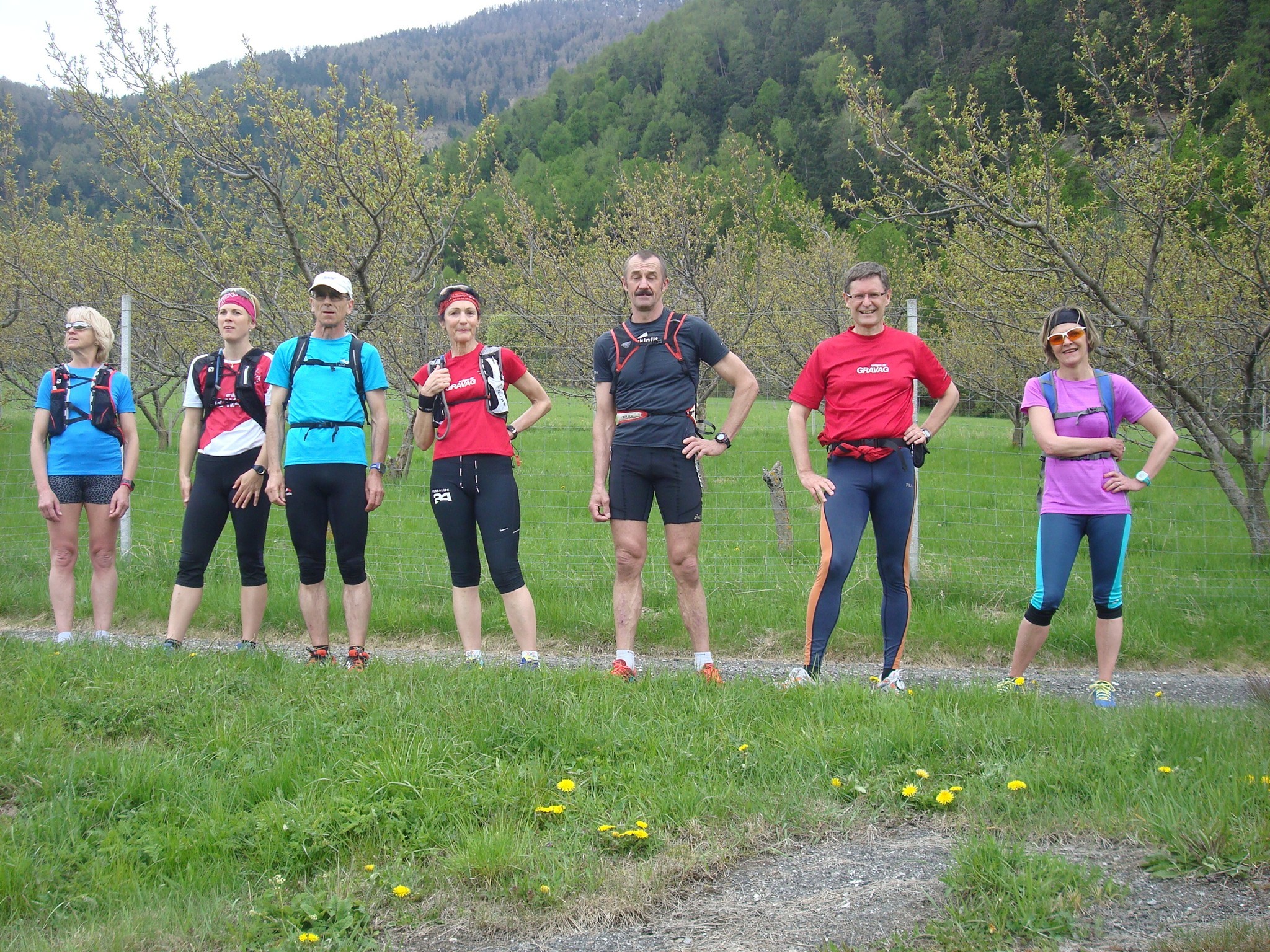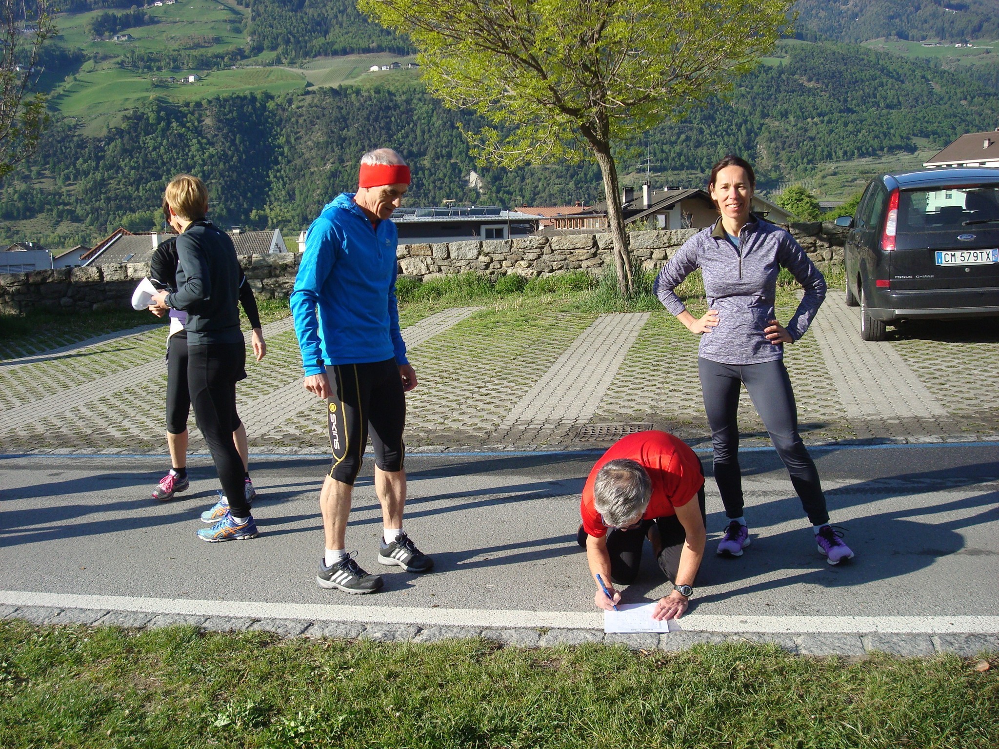 Am Samstag um 07.30h eröffnete Berni das Training auf dem Marktplatz mit einer Denksportaufgabe, was alle Teilnehmer ohne straucheln meisterten. Felix übernahm danach und wir starteten bergwärts. Nach dem Einlaufen und Dehnen forderte ein anspruchsvoller kurzer Rund Trail die MILAS während 15 Minuten. Wir mussten möglichst schnell den Weg über die Steine und Wurzeln finden und den steilen Abstieg über das Geröll als Erholung nutzen. Dieses Training war extrem effizient, zeitsparend und machte viel Spass. Zum Abschluss bewunderten wir den Wasserfall der ganz in der Nähe in die Etsch fliesst.