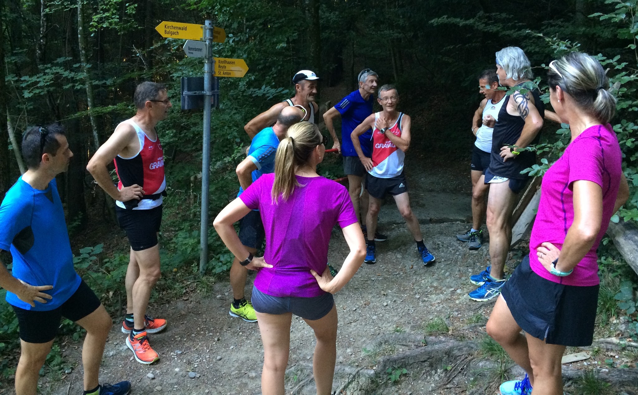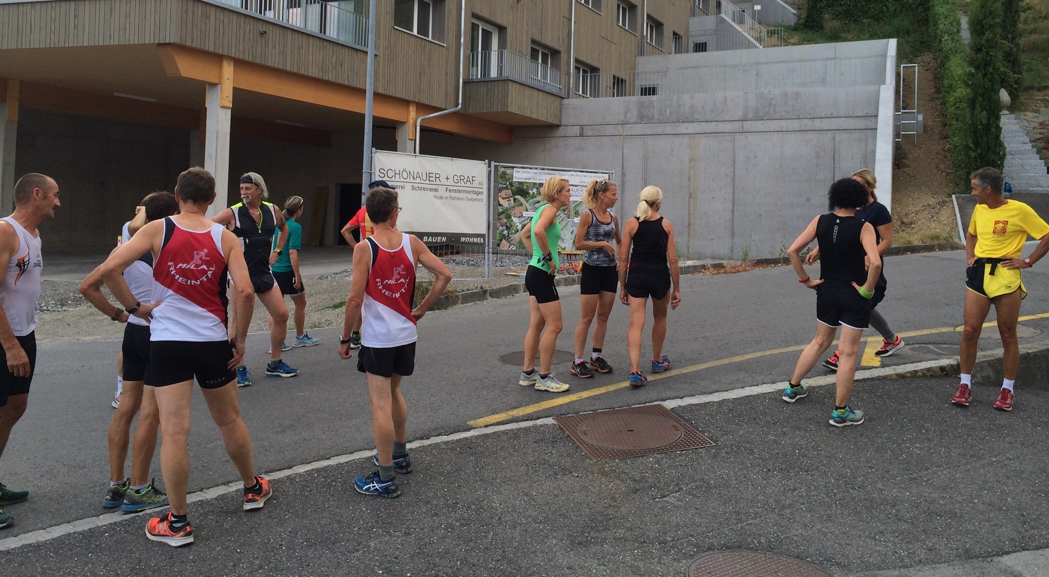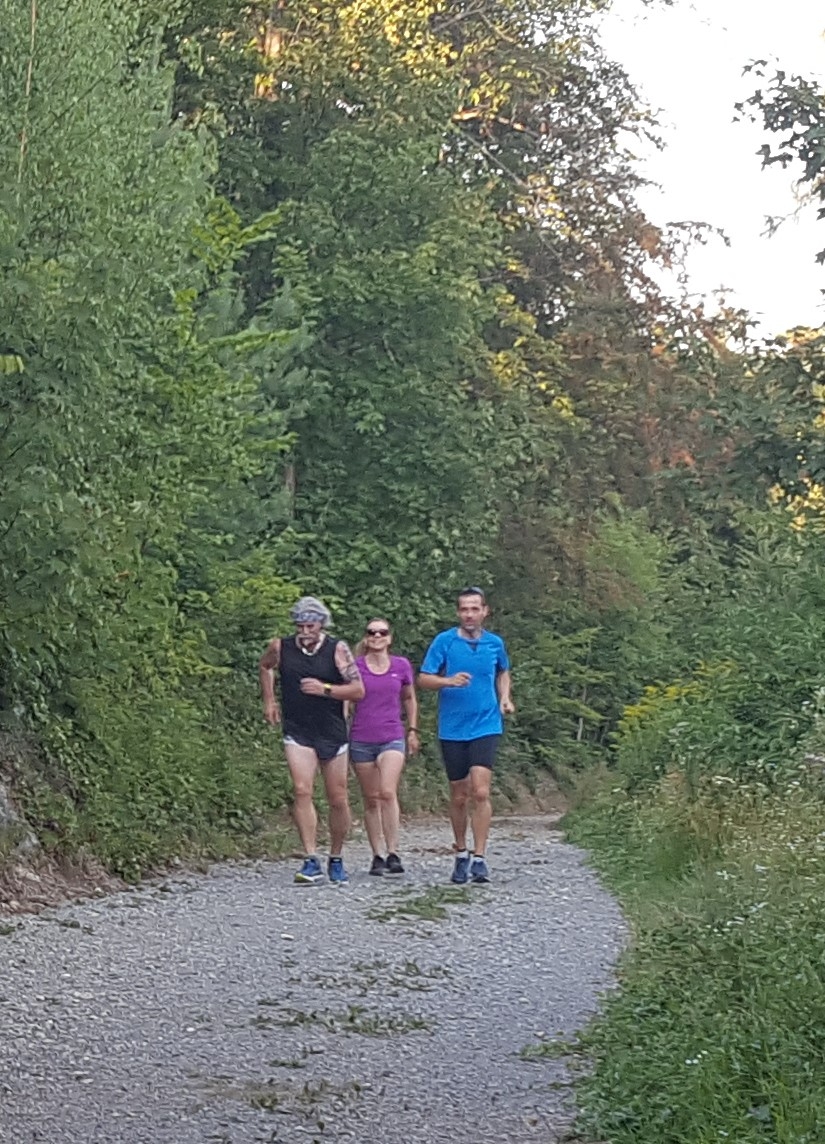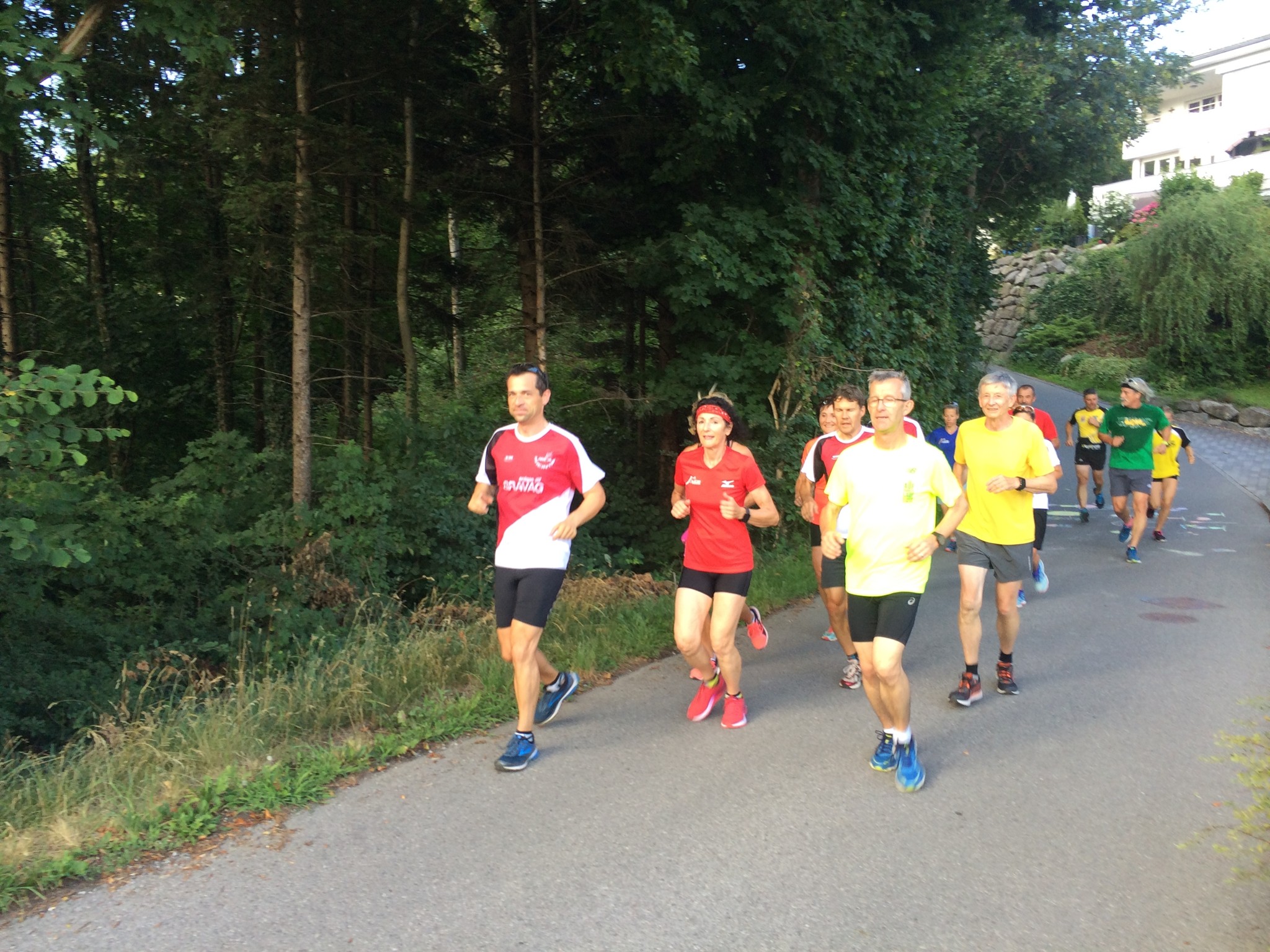 Das 3. Sommerprogramm 2018 hat dieses Mal bei mir stattgefunden. Um die 10 Milas haben sich für das bevorstehende Training bei mir im Garten versammelt. Das warme, schwüle Wetter verlangte zuerst nach etwas Flüssigem. Langsam sind wir zusammen Richtung «Hueb-Treppe» gejoggt. Die Stufen ganz nach oben trieben uns den Schweiss aus den Poren und haben uns gefordert. Der sehr steile Anstieg hoch zum «roten Hägli» haben wir zum grossen Teil im Pilgerschritt ausgeführt. Angekommen beim «roten Hägli» und mitten im Wald war die Temperatur angenehm und wir joggten weiter dem «Försterwegli» entlang und wieder hinab zum Forsthaus in Balgach. Die letzte Etappe nahmen wir über das Schloss Grünenstein zurück nach Rebstein. Schweissgebadet am Auenweg angekommen mussten wir zuerst unseren Flüssigkeitshaushalt in Ordnung bringen. Nach einer kurzen Erfrischung bei uns im Garten sind wir zum gemütlichen Teil übergegangen. Wir genossen eine feine Pizza und Pasta in der Pizzeria Punto Verde in Rebstein. Die lauschige Terrasse und das gute Essen liessen uns in Ferienstimmung abtauchen.