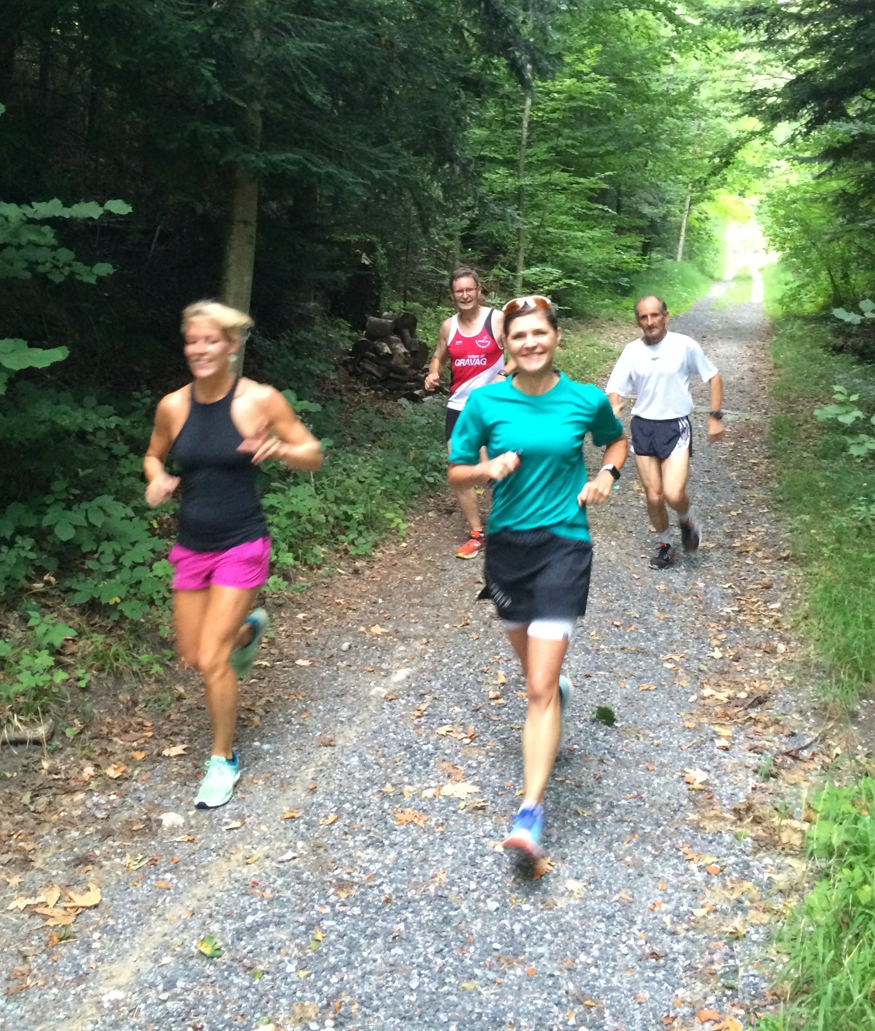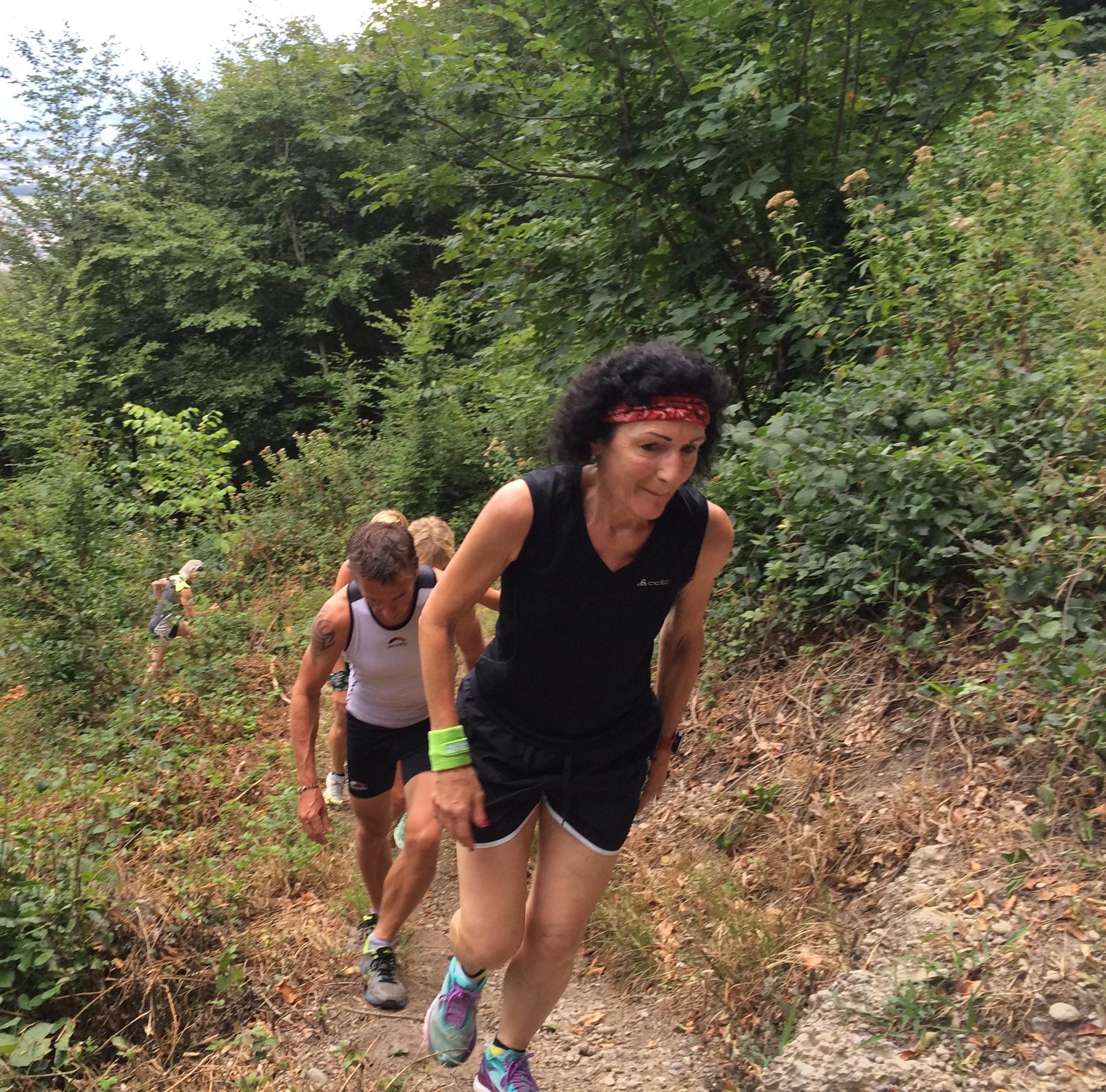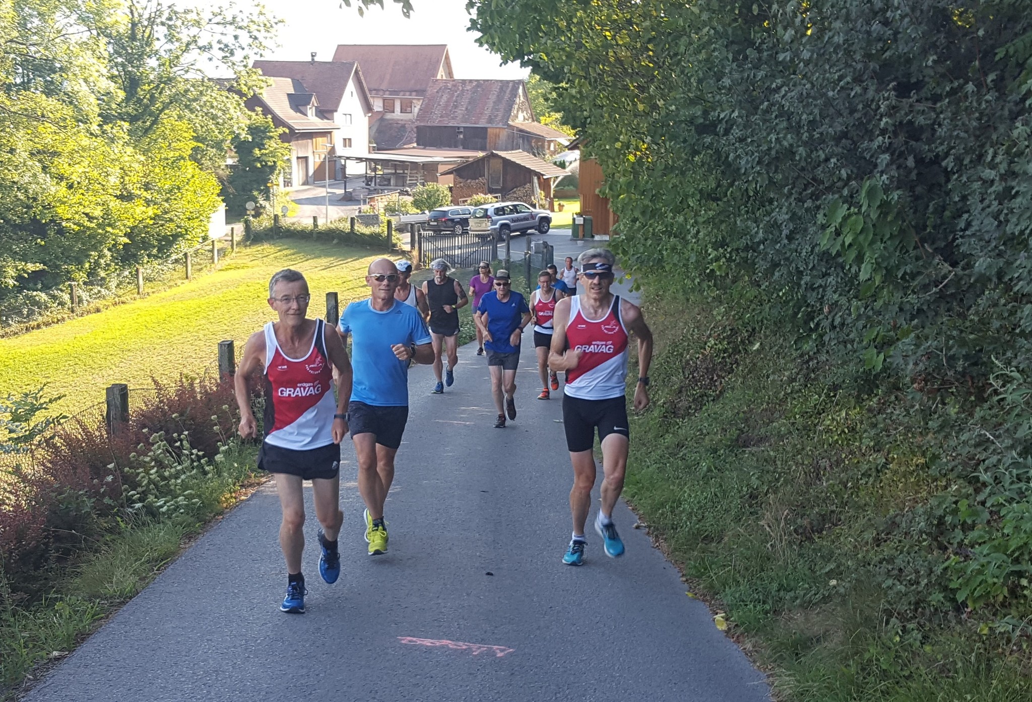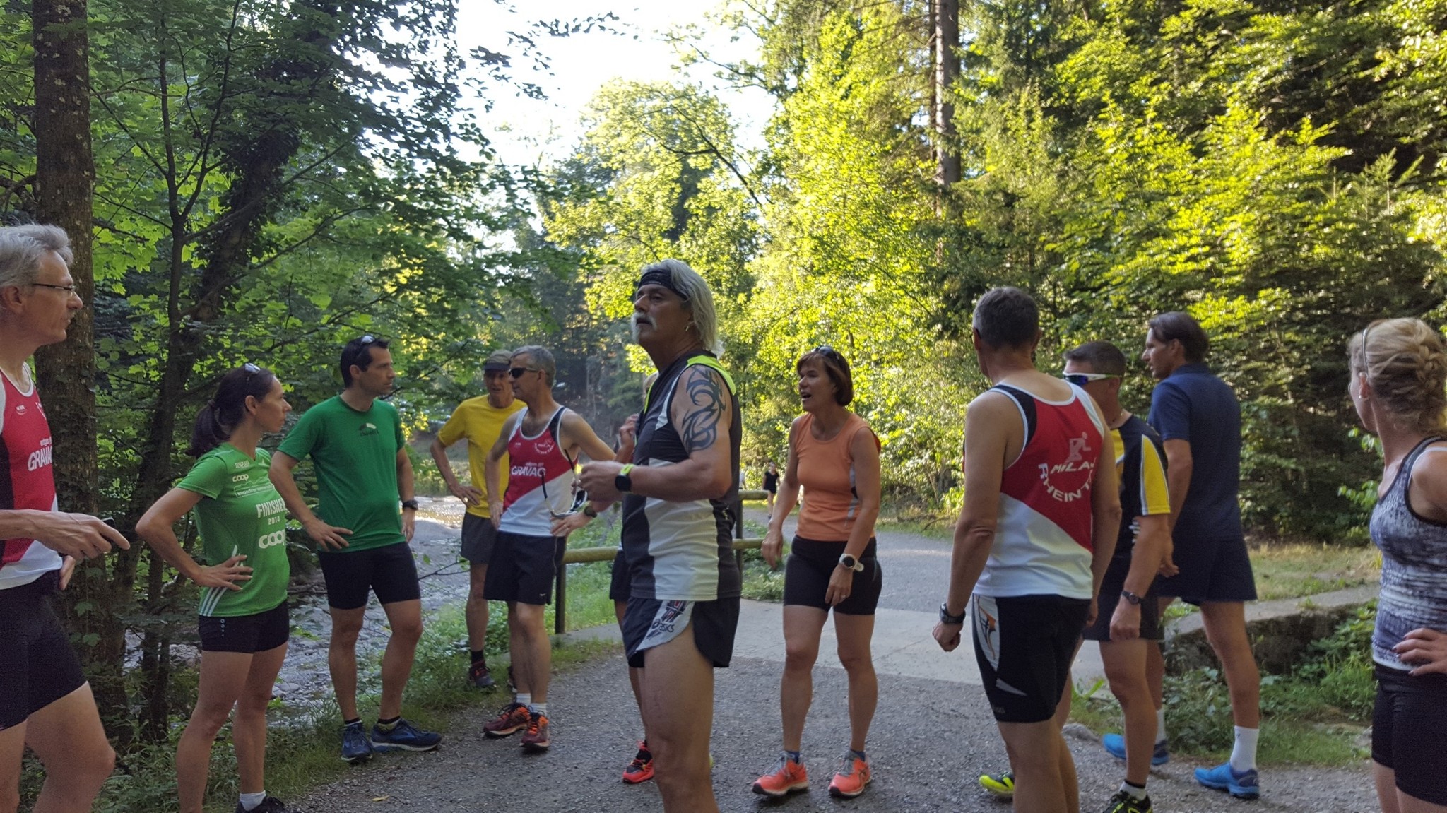 Das 3. Sommerprogramm 2018 hat dieses Mal bei mir stattgefunden. Um die 10 Milas haben sich für das bevorstehende Training bei mir im Garten versammelt. Das warme, schwüle Wetter verlangte zuerst nach etwas Flüssigem. Langsam sind wir zusammen Richtung «Hueb-Treppe» gejoggt. Die Stufen ganz nach oben trieben uns den Schweiss aus den Poren und haben uns gefordert. Der sehr steile Anstieg hoch zum «roten Hägli» haben wir zum grossen Teil im Pilgerschritt ausgeführt. Angekommen beim «roten Hägli» und mitten im Wald war die Temperatur angenehm und wir joggten weiter dem «Försterwegli» entlang und wieder hinab zum Forsthaus in Balgach. Die letzte Etappe nahmen wir über das Schloss Grünenstein zurück nach Rebstein. Schweissgebadet am Auenweg angekommen mussten wir zuerst unseren Flüssigkeitshaushalt in Ordnung bringen. Nach einer kurzen Erfrischung bei uns im Garten sind wir zum gemütlichen Teil übergegangen. Wir genossen eine feine Pizza und Pasta in der Pizzeria Punto Verde in Rebstein. Die lauschige Terrasse und das gute Essen liessen uns in Ferienstimmung abtauchen.